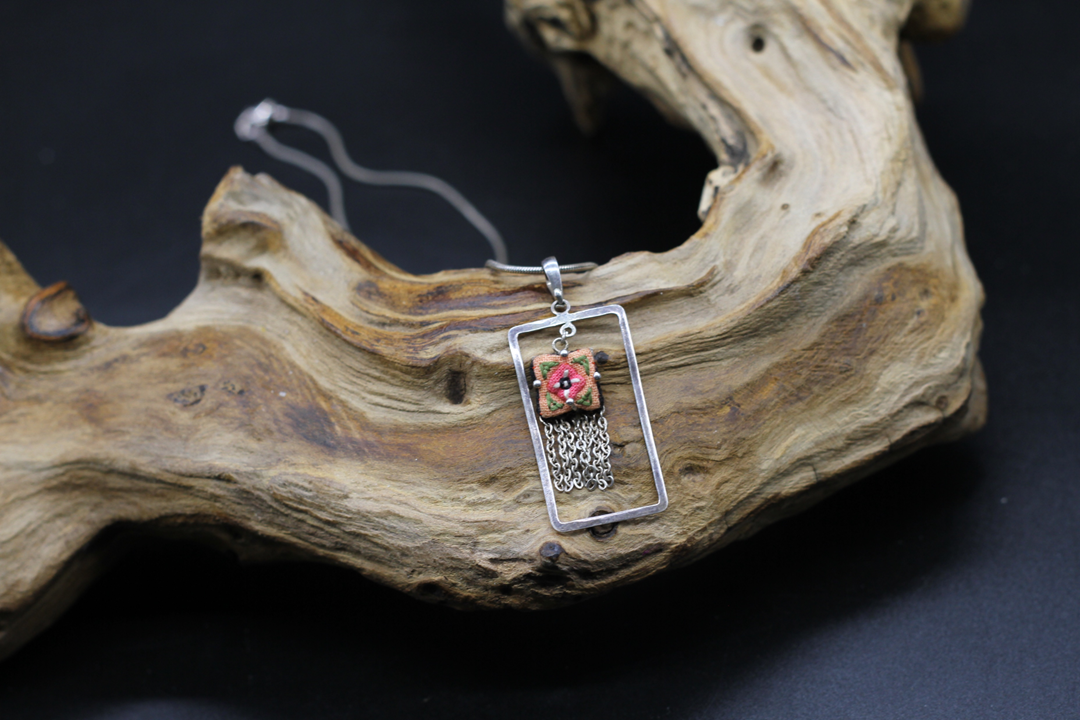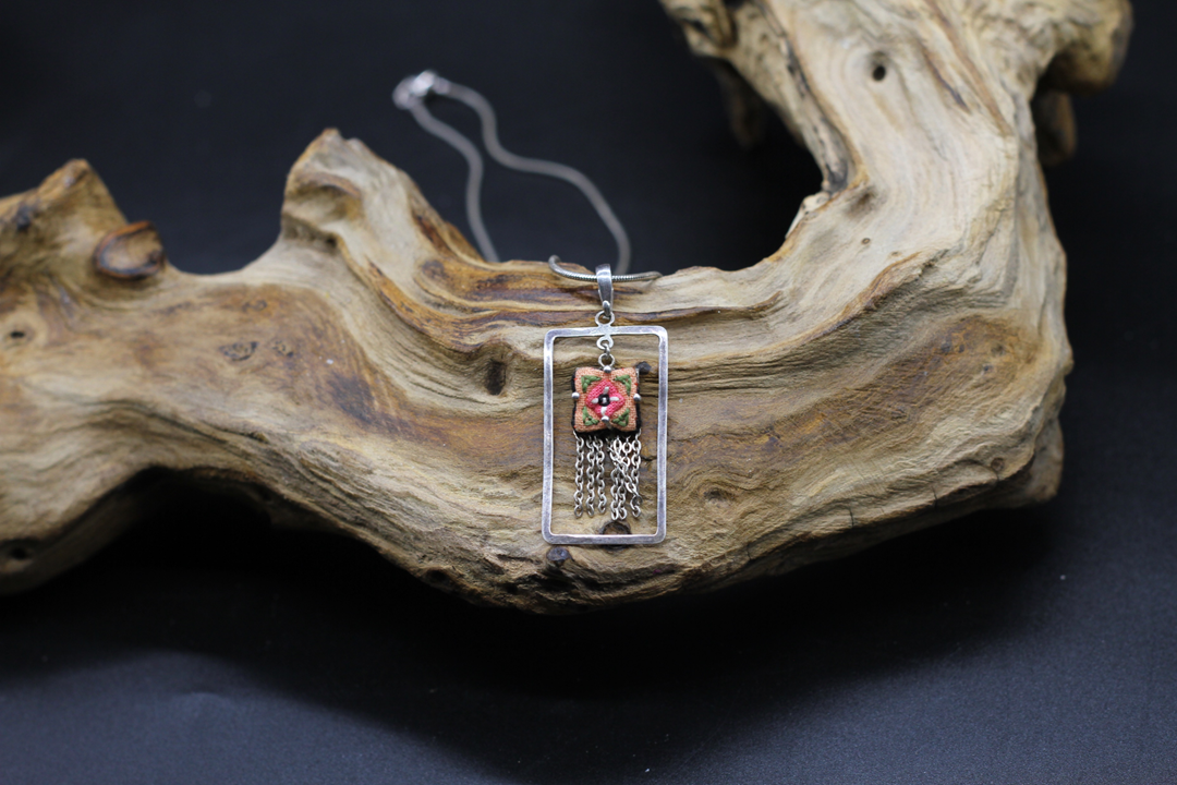 Wonderful HAND STITCHED pendant with real silver chain 925. This is a VINTAGE MASTER PIECE where two techniques – embroiding and metalwork – are combined in a unique and fascinating way as a WONDERFUL COLLIER. We found this unique design at a private collection from the ALPS and it is in a good to very good condition with normal signs of age.