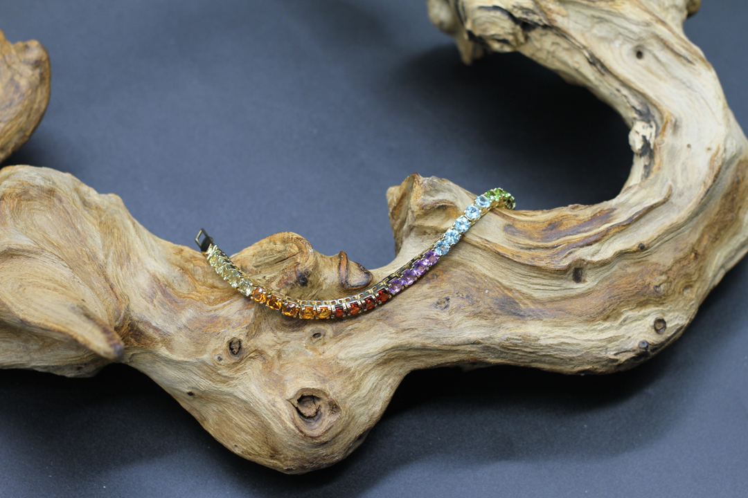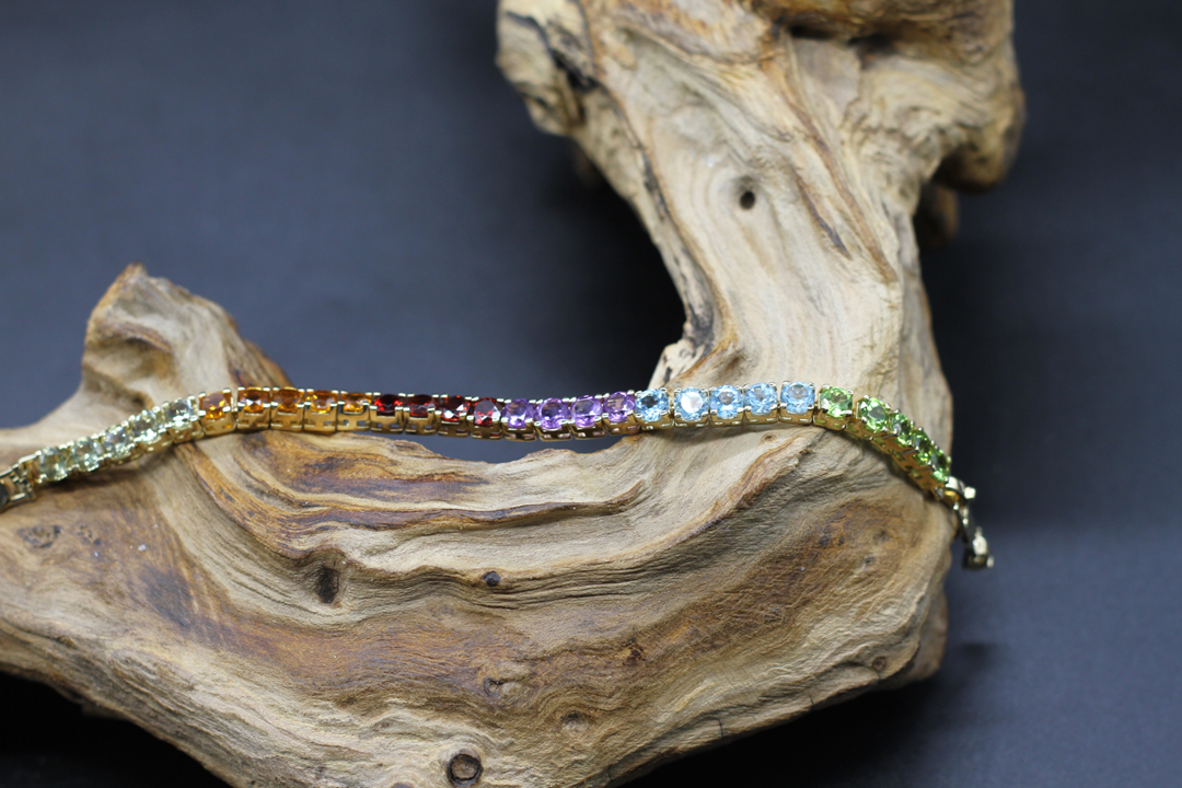 Wunderschönes, handgefertigtes Schmuckstück von ARDECO in Regenbogenfarben. Für dieses Armband verwenden wir unter anderem folgende echte wertvolle STEINE: Peridot, Granat, Citrin und Amethyst. Die Steine haben einen Durchmesser von je 5 mm. Das Metall ist 925er Sterlingsilber, 18 Karat vergoldet. Zertifiziert von einem österreichischen Labor.