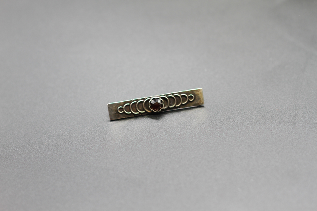 This beautiful hand made brooch is antique and made of 800 silver and a 6 mm flower cut garnet stone. It bears an 800 silver hallmark and therefore likely dates from the early 20th century or even the late 19th century. 800 silver was frequently used in combination with garnet stones in the later 19th century, especially in European Historicism. This elegant & unique brooch measures 45 by 8 mm and we bought it from a Viennese collector. Further images you find on our Youtube Portal: Watch our Youtube Channel for Video Description