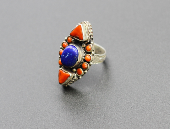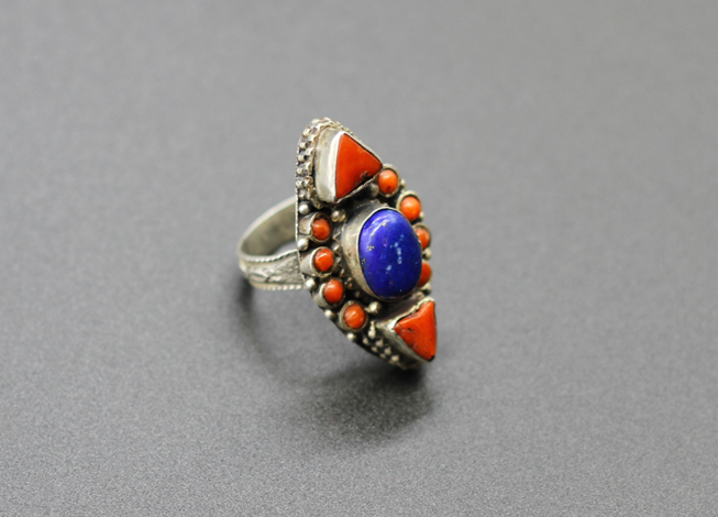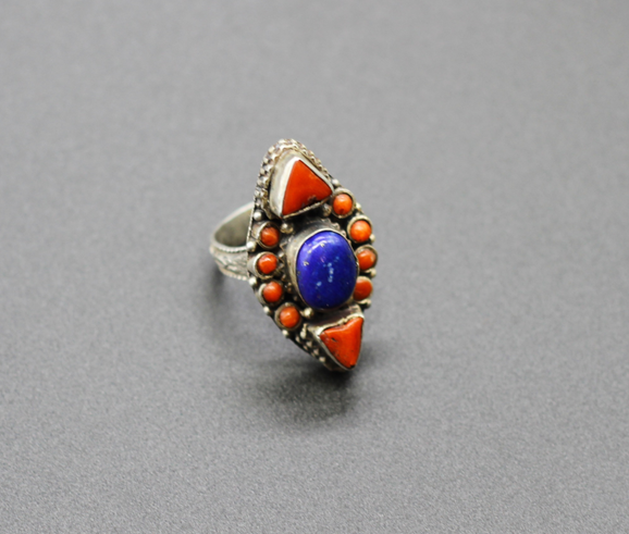 This beautiful hand made piece of jewelry is unique and one of the most wonderful pieces we ever had at our jewelry store! It is made of 925 silver, features handmade silver elements, both on the ring plate as well as on the ring itself around the finger. Further more, this unique piece of European Ring Size 57,5 is hand crafted with 10 pieces of coral and a beautiful lapis lazuli stone. We bought this piece from a private collector in France, but this masterpiece originally comes from Central Asia.