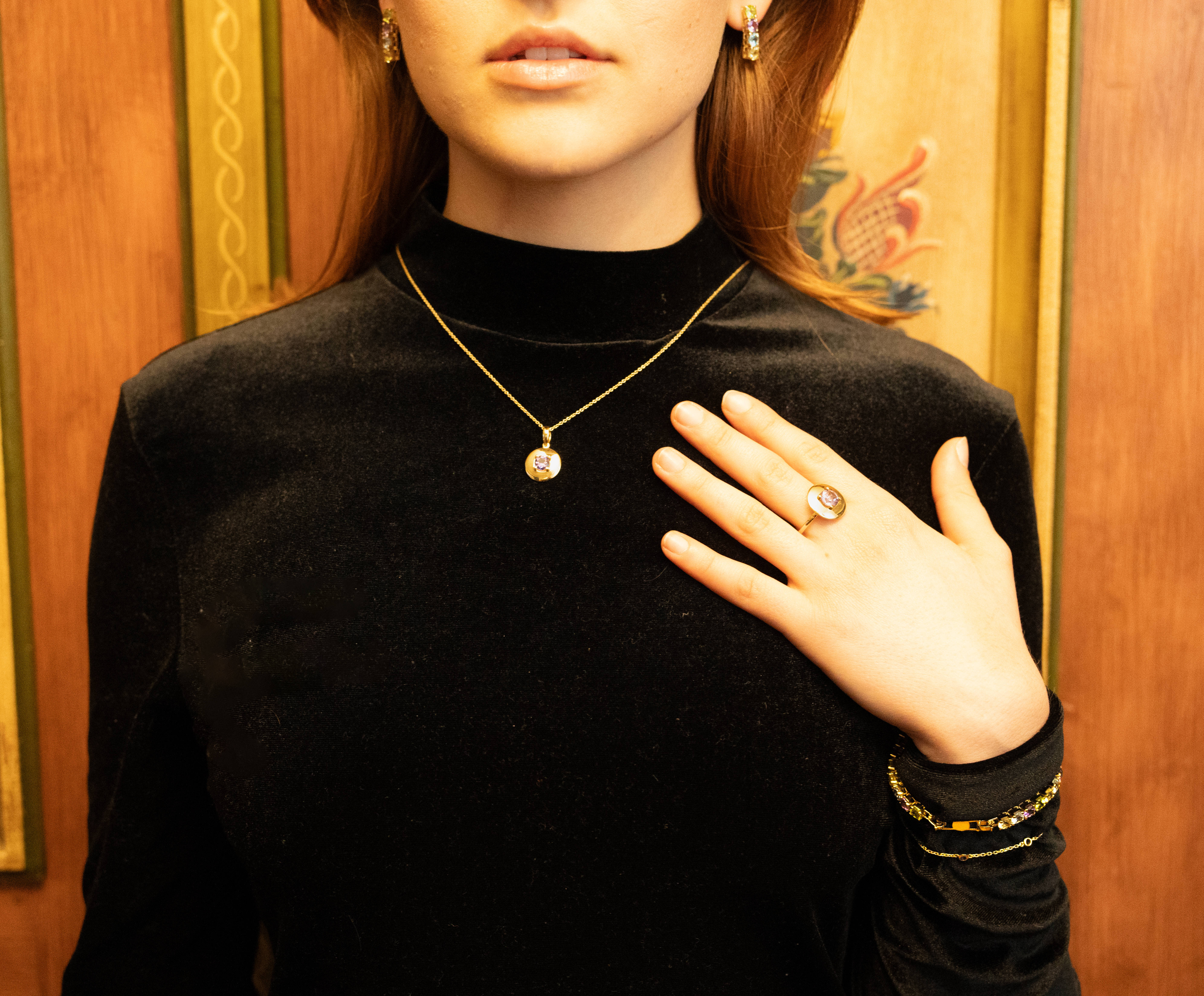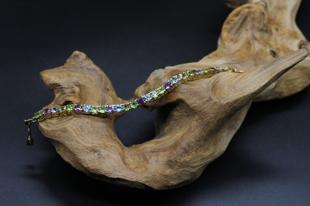 Wonderful Bracelet, handmade. 15-19 cm long, adjustable with two extensions links included. Color Stone diameter 5 mm. Net weight 16,8 g. 14 carat certifed gold. Certified by Austrian Laboratory. Precious Natural Color Stones: Blue Topaz, Green Goldstone, Peridot, Amethyst.