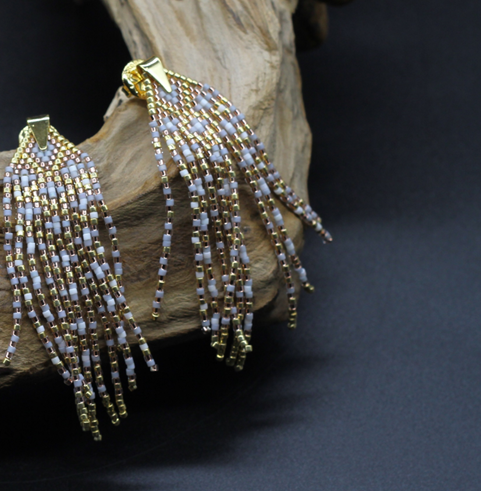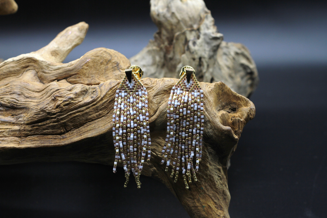 Wonderful Pair of Earrings, handmade with LOVE of Miyuki Glass beads. Dimensions approximately 7.5 cm long by 2 cm wide. Metal: silver, gold plated. NUIT 1.001 is a unique color combination WHITE, GOLD, ROSÉ & TAUBENBLAU from ARDECO
