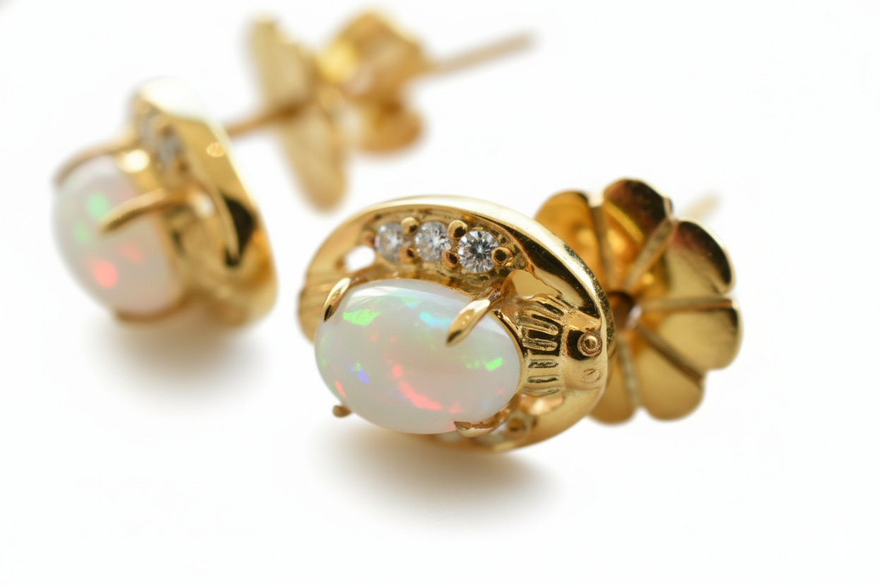 Handmade Scarab Earstuds with Ethiopian Opal Stones. Wonderful, every pair is unique. Best materials real silver 925, gold plated 18 Karat Gold. Hand selected Ethiopian Opal stone in shiny colors decorated with White Topaz stones. Scarab is connected with sun-god Ra since ancient Egyptian culture. It stands for Existence, Development & Growth. It represents the circle of life and death and therefore the Scarab is a protector.